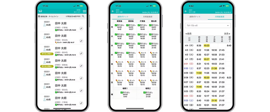 iOS・Androidのいずれの端末でもご利用いただけるようになりました。タイムラインや週間ポケット・月間服薬歴などスマートフォンでも見やすく、服薬アラート発生時にプッシュ通知を受け取ることが出来ます!